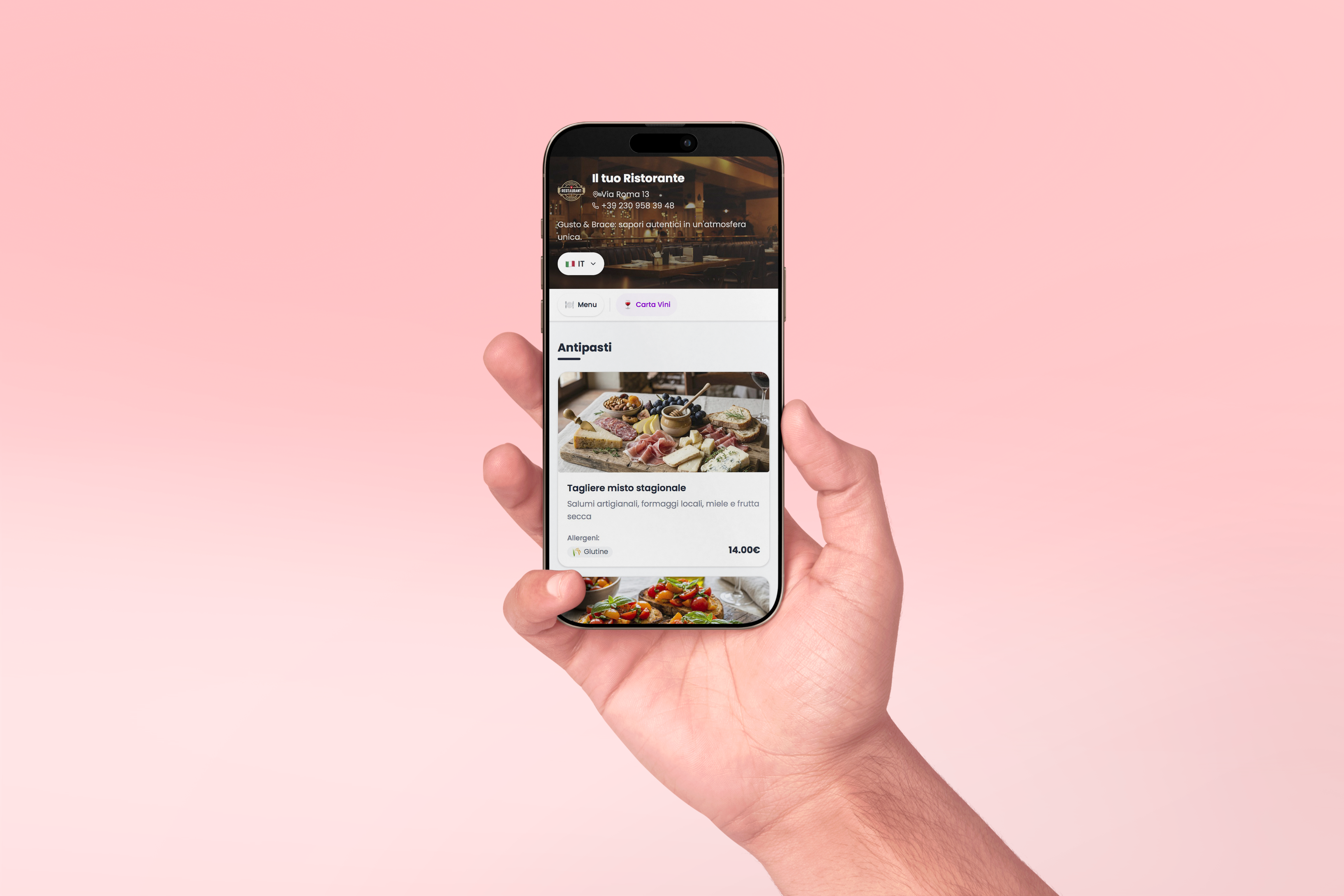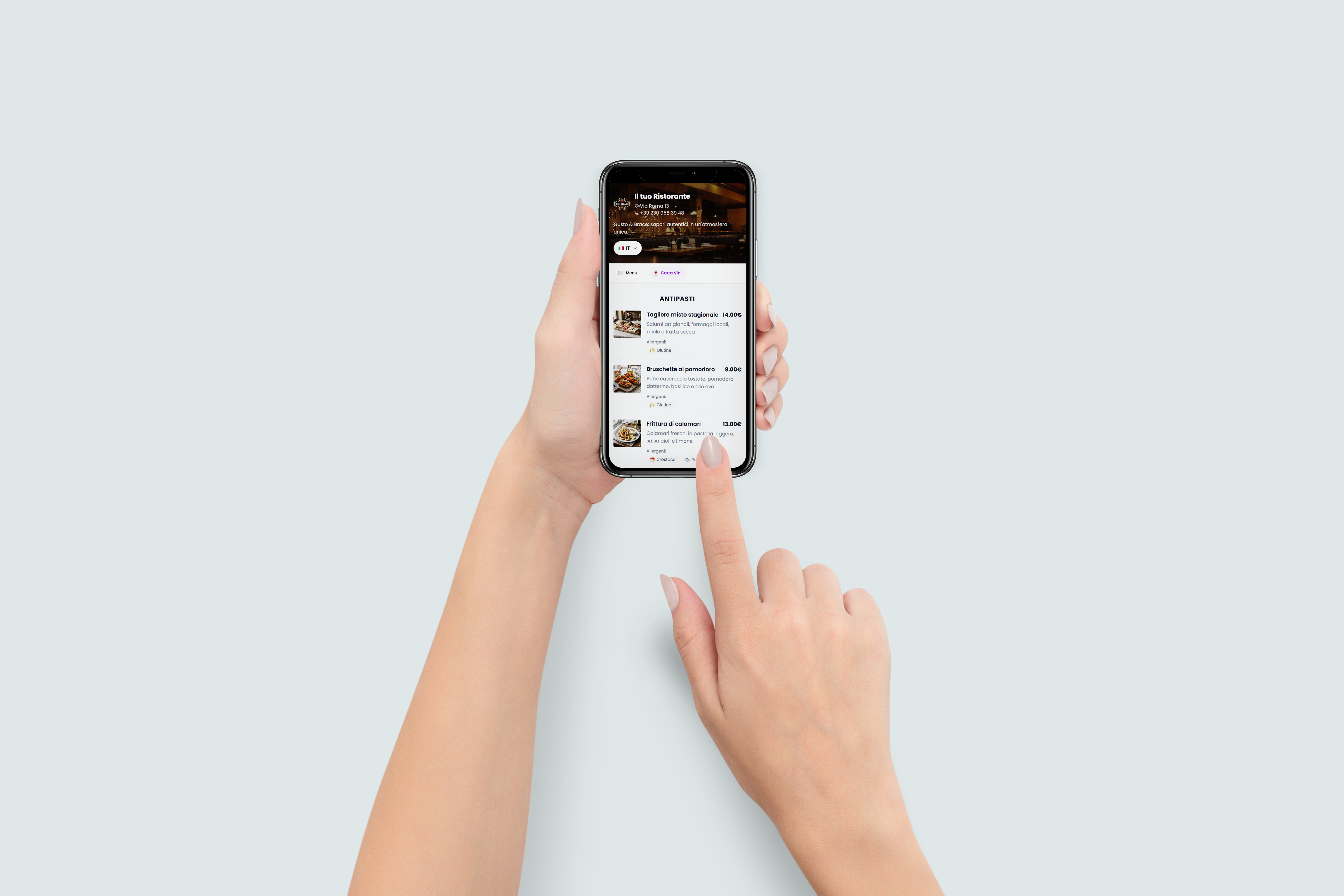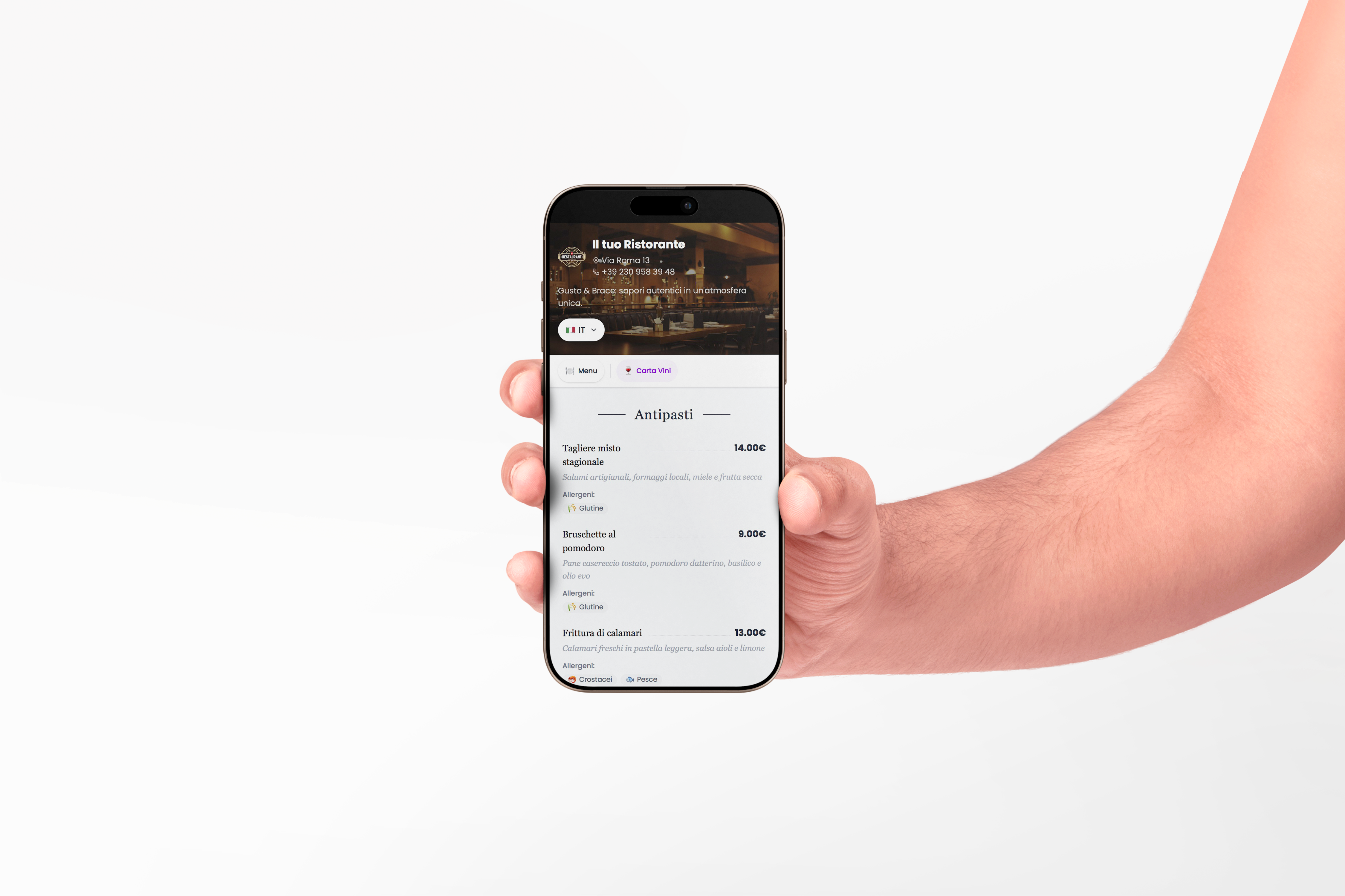 They scan the QR code you place on the tables. A smartphone-optimized web page opens, with the menu in their language, photos, allergens and always up-to-date prices.